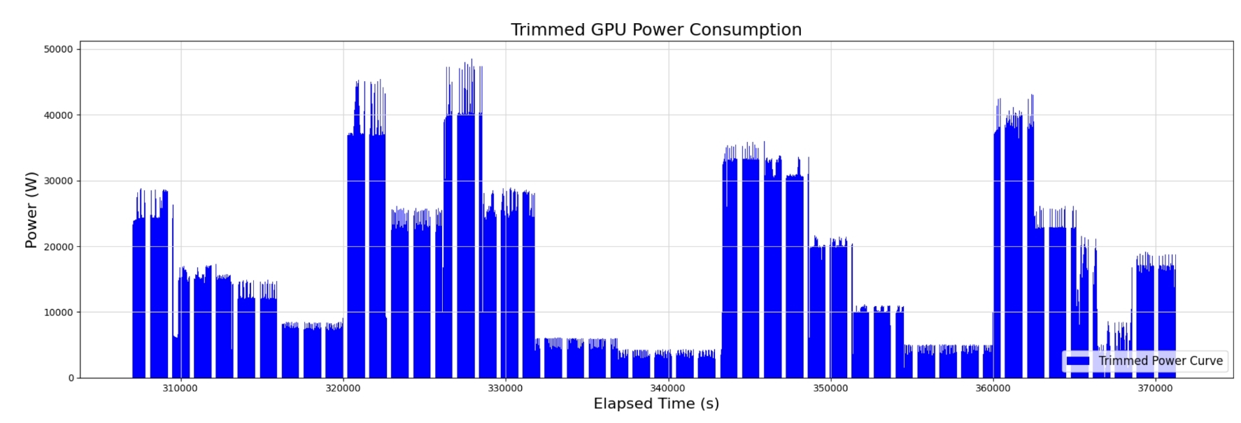BERT 모델은 전력 소비가 매우 동적(dynamic)으로, 최대 약 50kW까지 도달할 수 있으며, 낮은 전력 상태와 높은 전력 상태를 자주 반복함. 이러한 변화는 모델의 작동 단계에 따라 발생하며, 데이터 로딩 순방향 계산 (forward pass) 역전파 (backward pass) 파라미터 업데이트에 따름