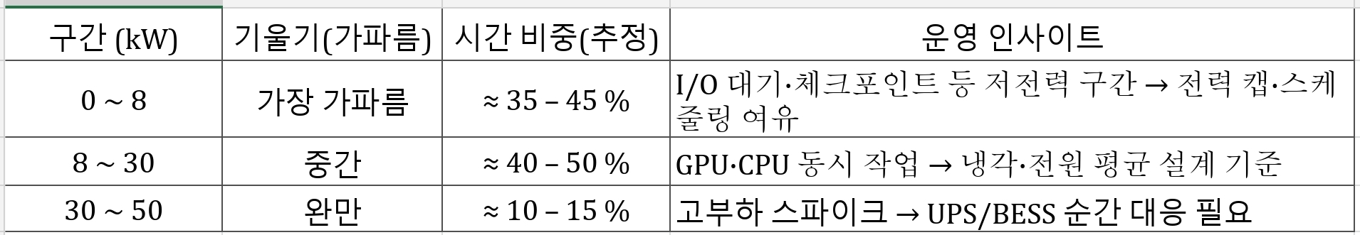 BERT 모델을 사용했을 때 전력이 순간적으로 50kw까지도 올라갔지만 4일(96시간) 중에 약 2시간 남짓에 불과합니다. 하지만 그 짧은 시간을 cover하기 위해 냉각. 전원. 그리드 설계 난이도를 결정합니다.