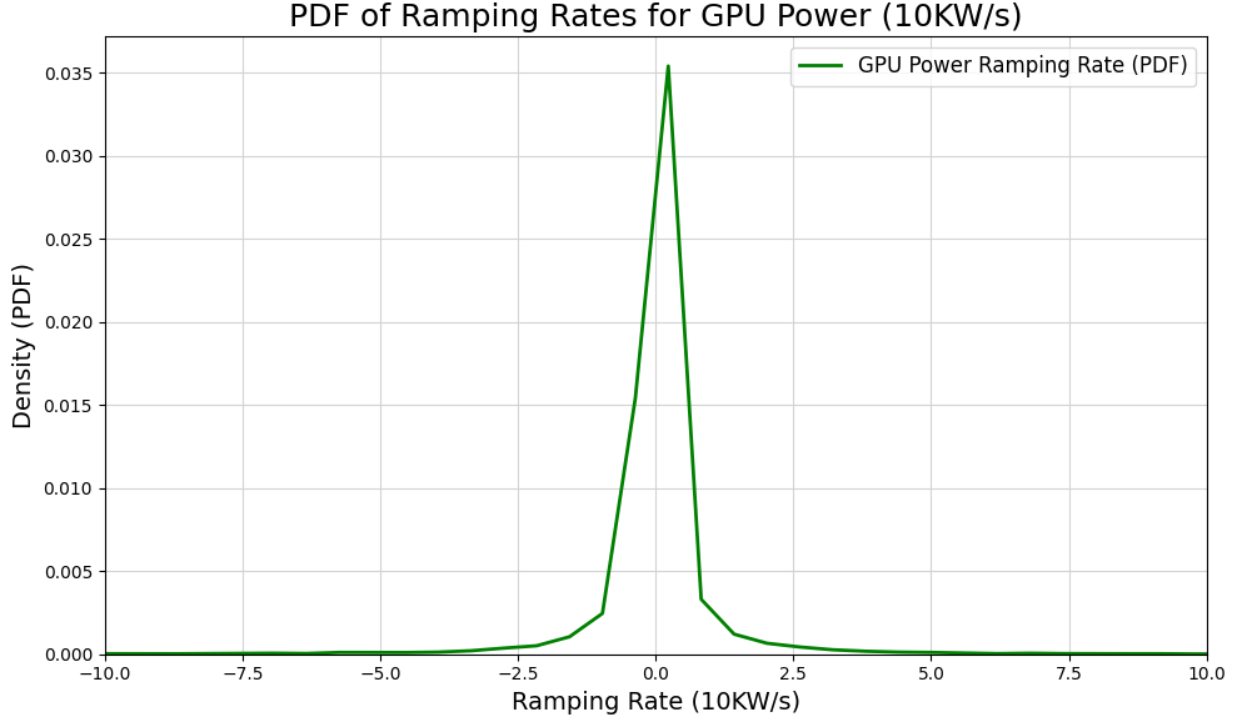 세로축은 일어날 확률을, 가로축은 Ramping rate 즉 변화 정도를 나타냅니다. ramping rate가 거의 0 ~ 0.5 kw 범위에 있을때 나타날 확률이 가장 높게 나타납니다.(위로 뾰족) 즉 대부분의 순간에는 전력의 변화가 크지 않지만 가끔식 1초에 10~20kW까지 up/dwon이 있어 설계시에는 +-20kw/s 램프를 수 초 동안 견딜 수 있는 크기로 BESS, UPS등이 설계되어야 합니다.