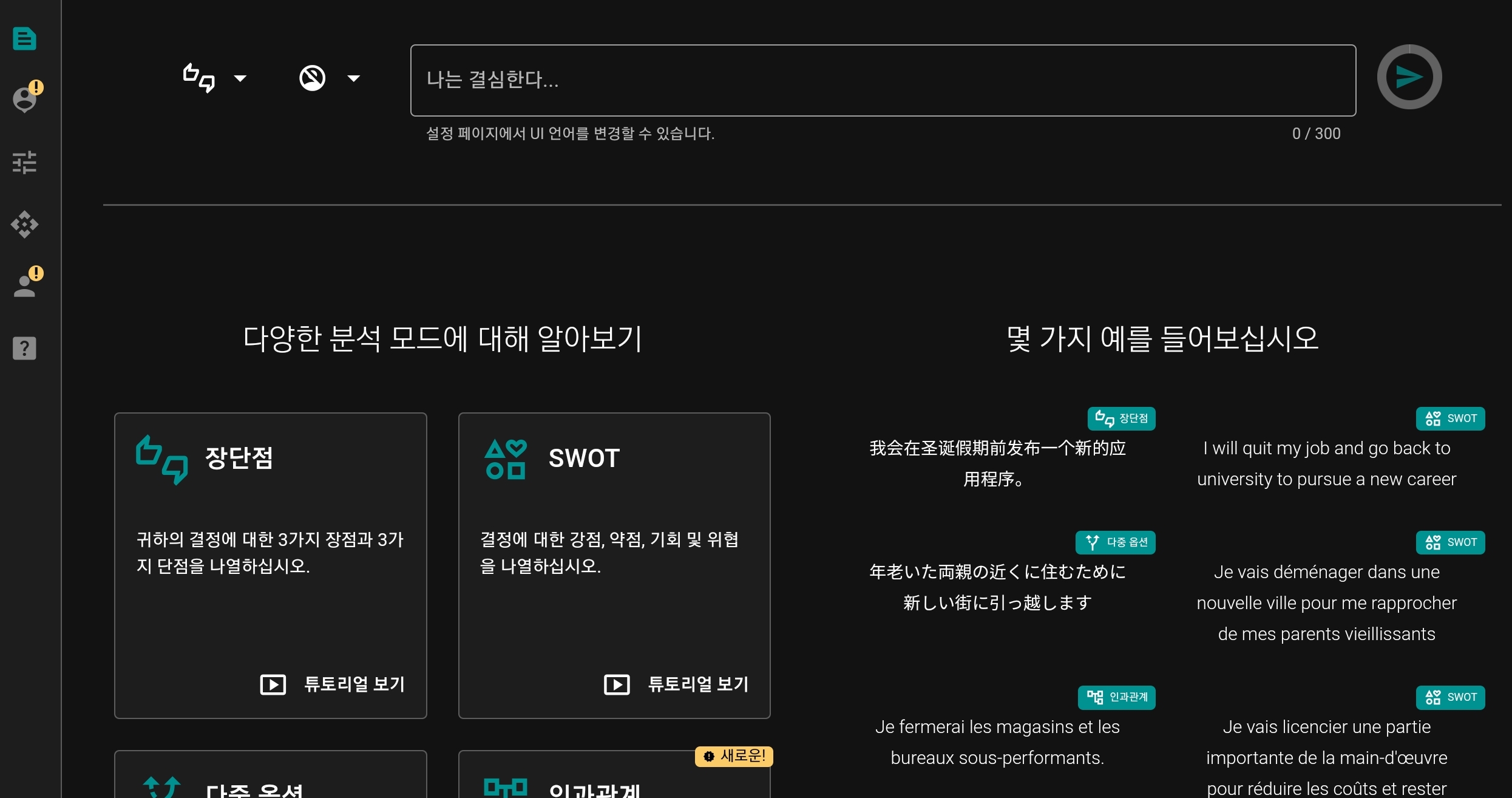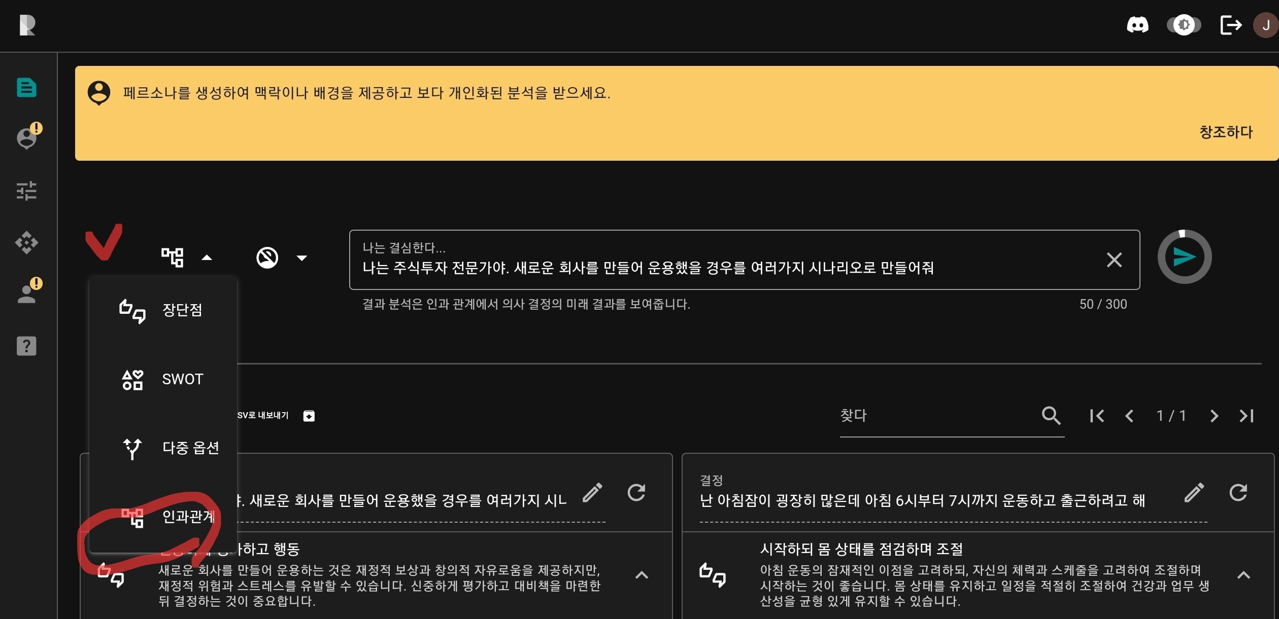 맨 아래 사진의 빨간색 부분을 클릭하면 의사 결정사항에 대한 장/단점, 인과관계, SWOT, 페르소나 설정등을 통한 분석 결과를 얻을 수 있습니다.