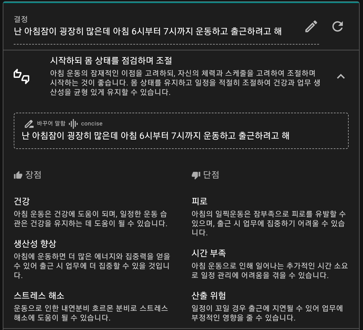 전 예시로 아래와 같이 적어 보았더니 ~ 장/단점을 분석해 주었습니다. 역시 아침에 잠을 많이 자야겠다는 지극히 주관적인 해석을 해 봅니다.