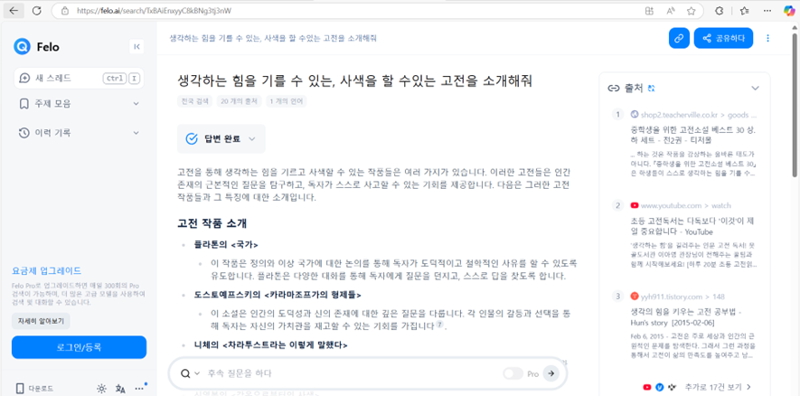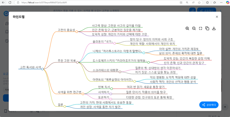 저는 생각하는 힘을 기르고 싶어서 어떤 고전 작품을 읽는 것이 도움이 될지 물어보니 그에 대한 대답과 그 대답을 보기 쉽게 mind map 형태로 정리하여 보여주었습니다.