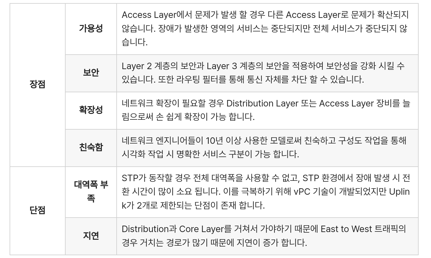 Data Center 운영을 위해서는 여러가지 요서가 결합되어 유기적으로 작용합니다. 통상적으로 Data Center는 Network 구성시 흔히 3-Tier Network Architecture 구조를 많이 사용하고 있습니다. 이는 '코어-집선-액세스' 모델 또는 '코어-분배-액세스' 모델로도 불립니다. 특정 구역의 장애가 다른 구역에 영향을 주지 않기 때문에 고나리가 용이하고 Sacle-Out/Scale-Up 확장이 가능하기 때문에 많이 사용되었으나 구조를 변경하기 어려워 유연성이 떨어진다는 단점이 있습니다.