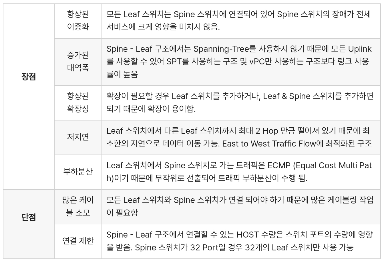 구조 변경이 어렵고 기술적 한계로 극복하지 못 했던 단점을 보완하기 위해 Spin-Leaf Architecture라는 새로운 Architecture는 높은 대역폭과 낮은 지연과 East to Wet Traffic 흐름에 특화 되었습니다.