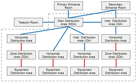 - 구간분배구역(ZDA, Zone Distribution Area): HDA와 EDA 간 수평 배선의 통합 지점으로, 활성 장비는 포함되지 않습니다. 향후 확장성과 재구성을 위한 선택적 공간입니다.