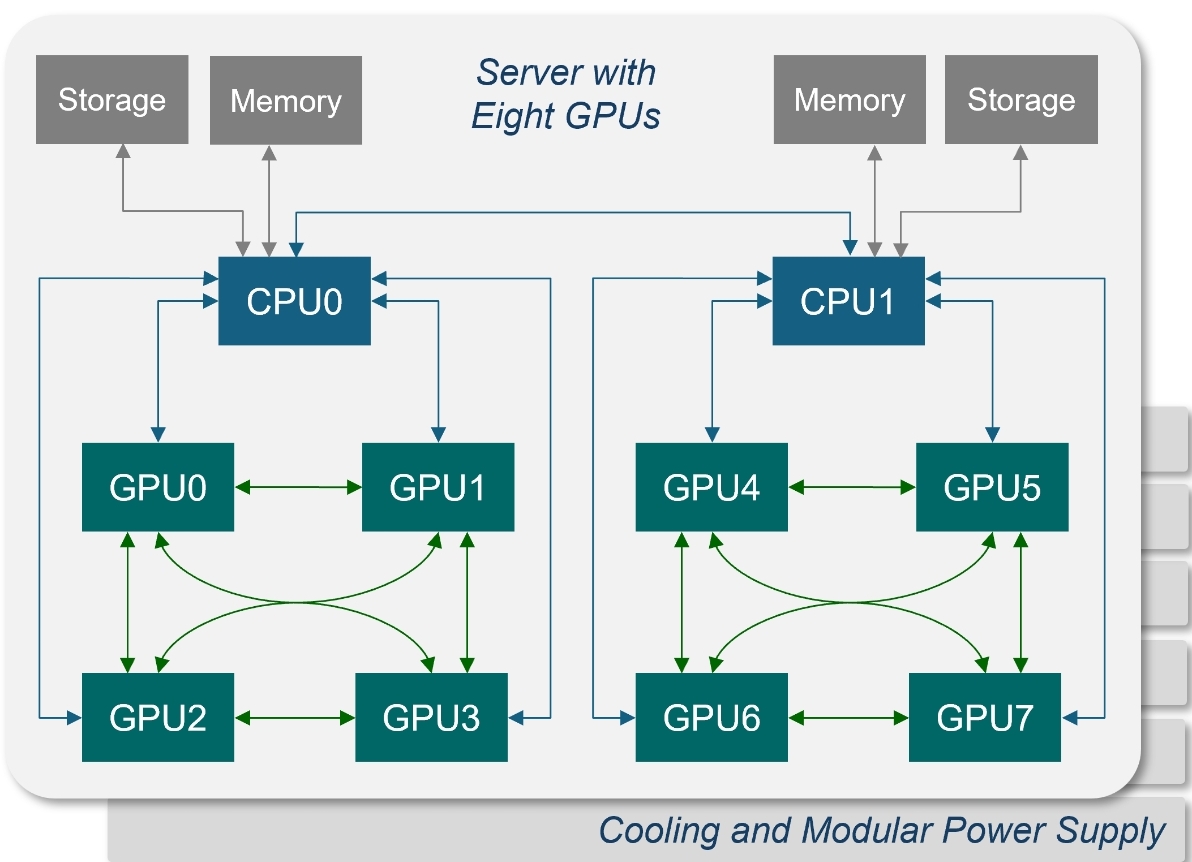 a) GPU: 여러 개의 고성능 GPU가 병렬 처리용으로 상호 연결되어 핵심 연산을 담당