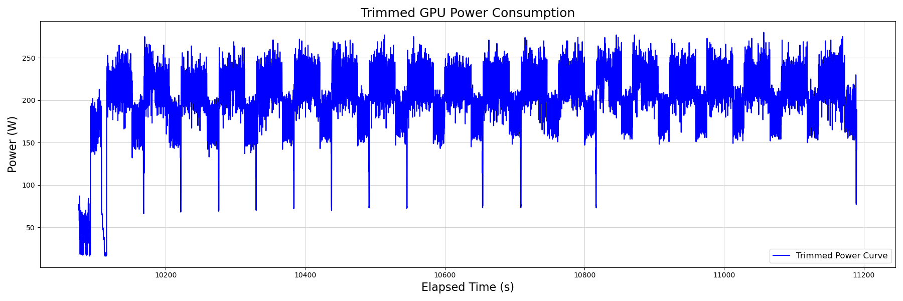 Fig. 11에서는 50 ~ 120W의 baseline과 250w의 Peak가 15 ~ 30초 간격으로 지속 반복됨. NVIDA (w/GPT-2) 대비 꼬리는 짧지만 중간 램프( 50 ~130w) 빈도가 두 배 이상을 보임