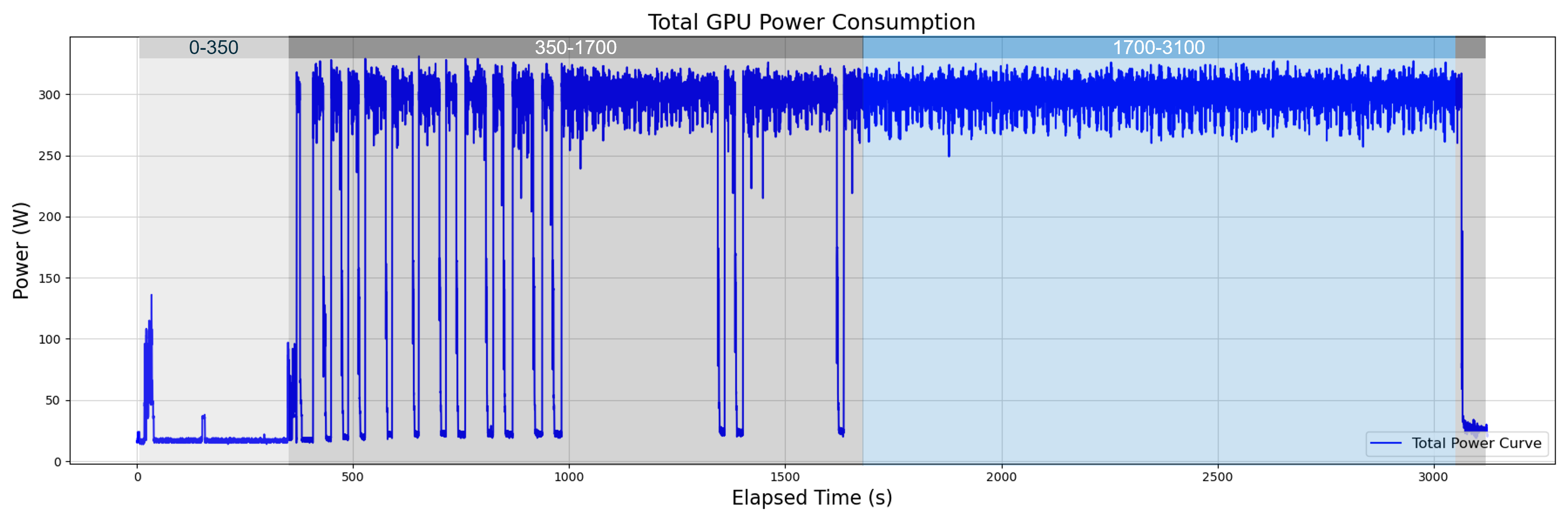 - 주요 학습 단계에서 전력 소비는 주로 250~330W 범위에서 변동합니다.