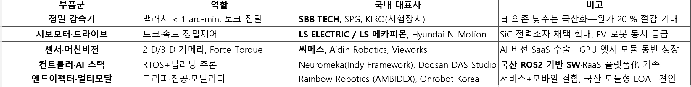 – 감속기·서보 국산화율 20 %대에 불과. SBB TECH·LS ELECTRIC 등이 진입하면 제조원가 15–25 % 절감 여력. 정부 ‘소부장 2.0’ 펀드 기회.