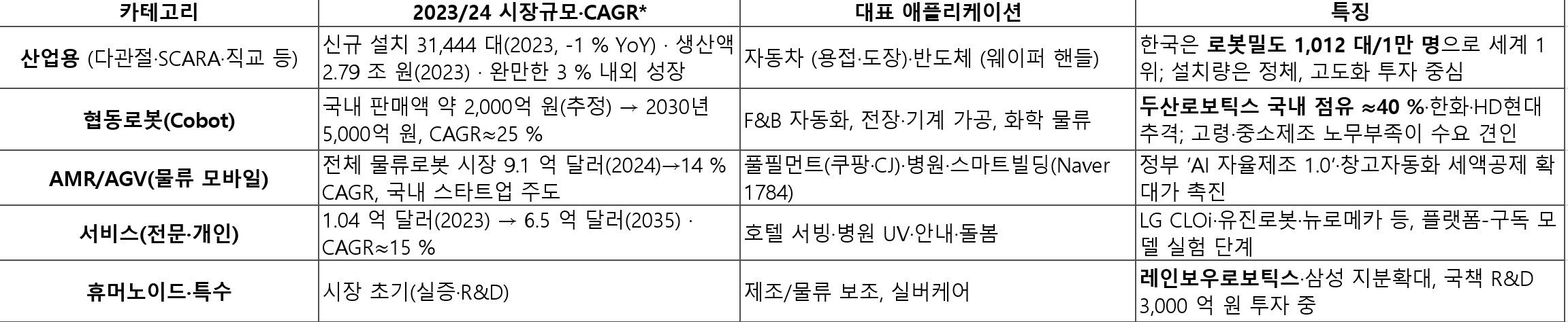 산업용(레거시) ↔ 협동·AMR(고성장) ↔ 서비스/휴머노이드(선점형)