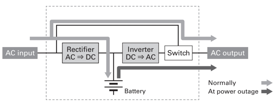 외부로 부터 공급되는 AC 전원을 DC로(Rectifier) 변환 후 배터리를 지속적으로 충전하면서 동시에 다시 AC로(Inveter) 재변환하여 전력을 공급하는 system으로 전원 공급이 중단될 경우 순간적인 전력 중단 없이 전원을 공급합니다.