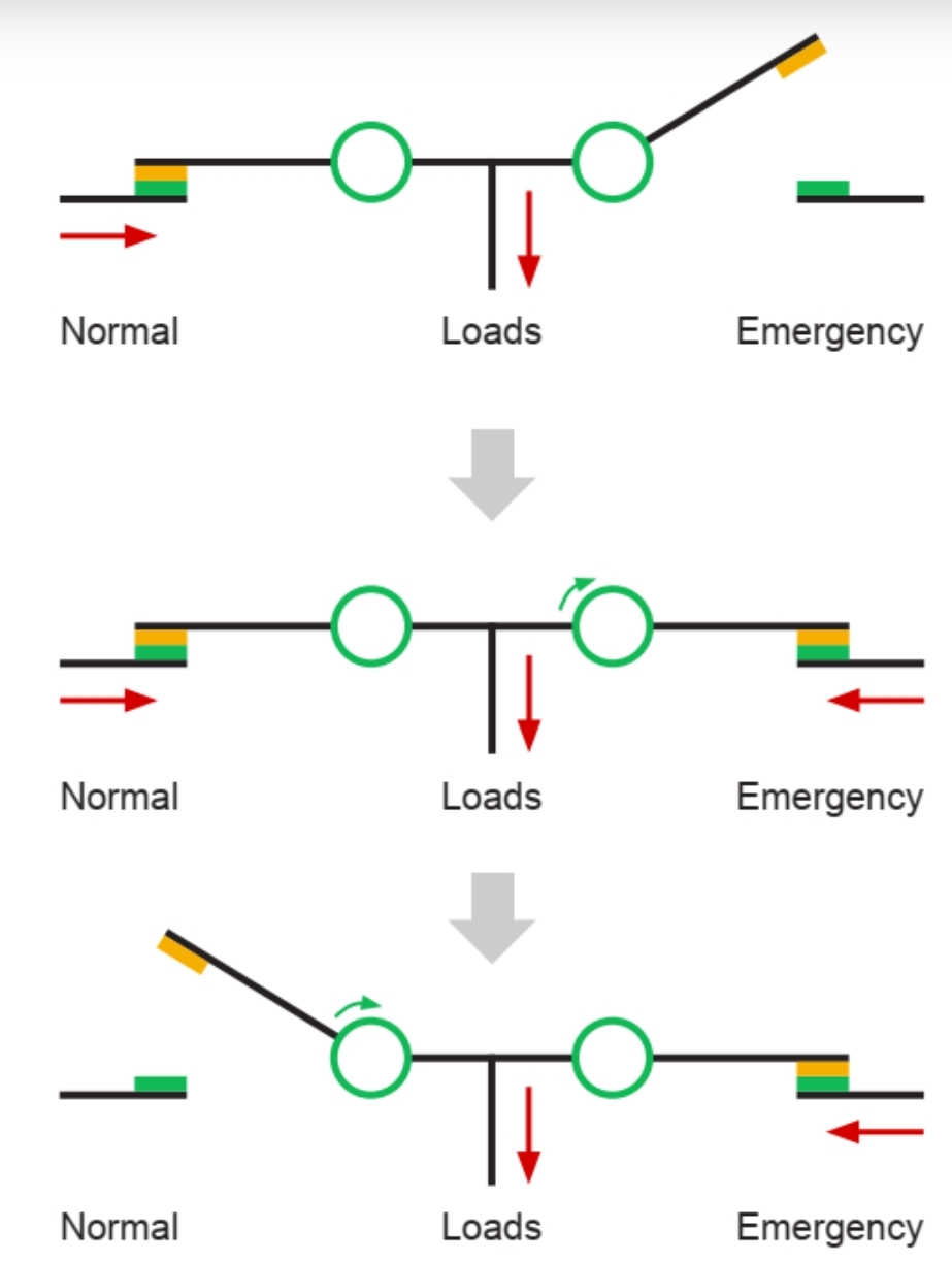Break-before-make transfer switch 라고하며 전력 전환시에 하나의 전원 공급원과의 접촉을 끊은 후에 다른 전원 공급원과의 접촉을하며, 이 과정에서 전기의 흐름이 중단되므로, 역전류를 방지할 수 있습니다.