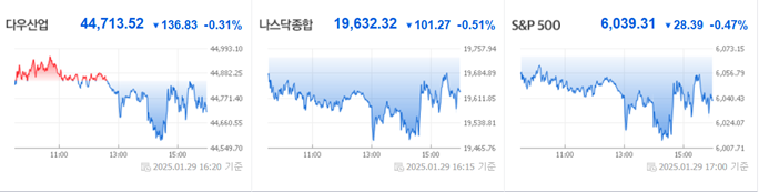 "당신은 경제 전문가 입니다. 2025년 1월 30일 미증시 마감 시황을 알려주세요. S&P500, 나스닥, 다우산업지수. 주요 envent 및 issue. 증시 변동 이유를 포함하고 다음에 다가오는 주요일정 2가지를 함께 알려주세요."