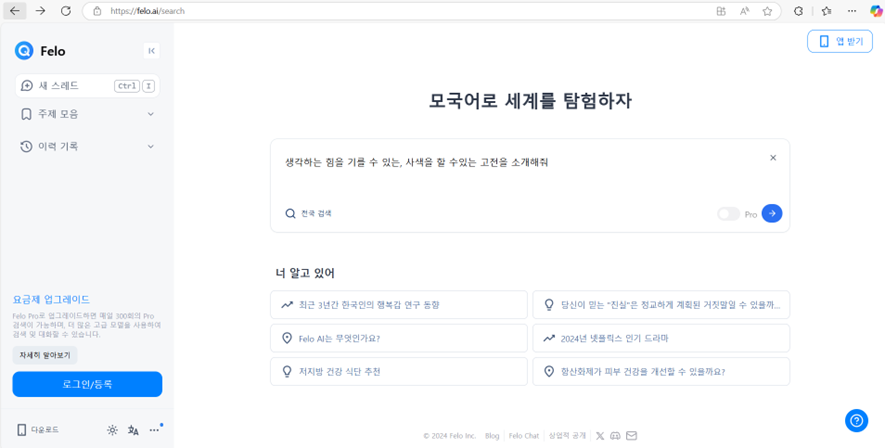 Felo AI 입니다. ChatGPT + mind map 기능을 한 번에 구현할 수 있는 AI Tool 입니다. GPT에 질문을해서 얻은 답을 마인드맵(Mind map)으로 바꿔서 저장할 수 있는 유용한 Tool 입니다. 저는 생각하는 힘을 기르고 싶어서 어떤 고전 작품을 읽는 것이 도움이 될지 물어보니 그에 대한 대답과 그 대답을 보기 쉽게 mind map 형태로 정리하여 보여주었습니다. 느낌은 ChatGPT와 비슷한 Perlexity를 기반으로 답변을 하고 다시 Mind map 형태로 변환하여 보여주는 것 같습니다. Felo - 당신의 무료 AI 검색 엔진 아직은 별도의 로그인 없이도 사용이 가능한 것 같습니다. ^^ 첫번째 화면입니다. 화면의 박스안에 원하는 질문을 하고 엔터 ~ ^^..